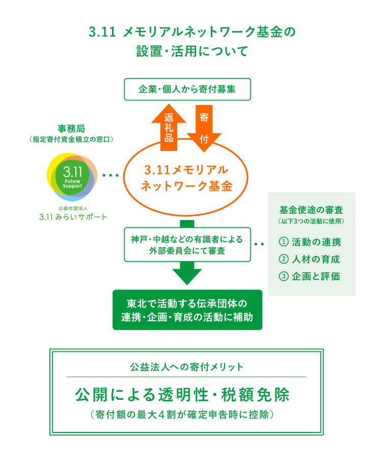 「3.11メモリアルネットワーク基金(設置:公益社団法人3.11メモリアルネットワーク)」は、皆さまからのご寄付を、東北各地で震災伝承、防災・減災活動に取り組む民間の団体につなぐためのしくみです。