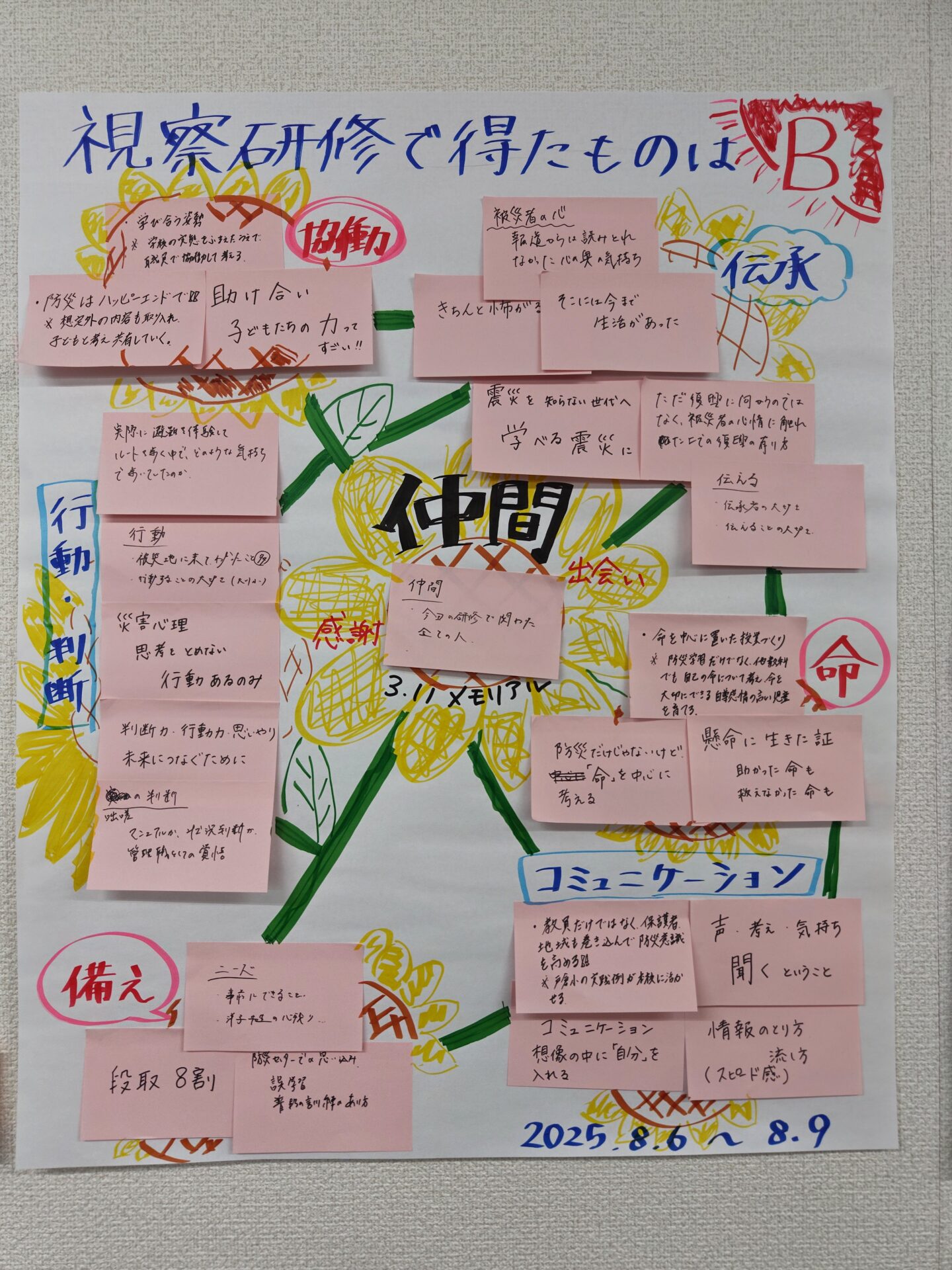 テレビや書物を通じて知っていた震災の記録も、現地の空気や人々の表情を伴って伝えられると、想像をはるかに超える迫力と重みをもって胸に迫ってきた。特に「生き延びたことに意味がある」という言葉が強く印象に残り、防災教育の核心は、知識の伝達にとどまらず「命の大切さ」を自分のこととして捉える感覚を育むことにあると実感した。私はこれまで、防災教育を「特別な教育」として捉え、年間行事や特設授業の中で位置付けることを意識していた。しかし、今回の研修を通して、防災教育は「防災」という枠を超えて、日常的な教育活動の中から自然に立ち現れるものだと気づいた。例えば、人権教育で互いを尊重する態度を育むことや、道徳教育で生命の尊さについて考えること、キャリア教育で将来を主体的に描くことも、すべて「自らの命を守る力」とつながっている。つまり防災教育は、学校教育全体の土台を支える基盤であると言える。