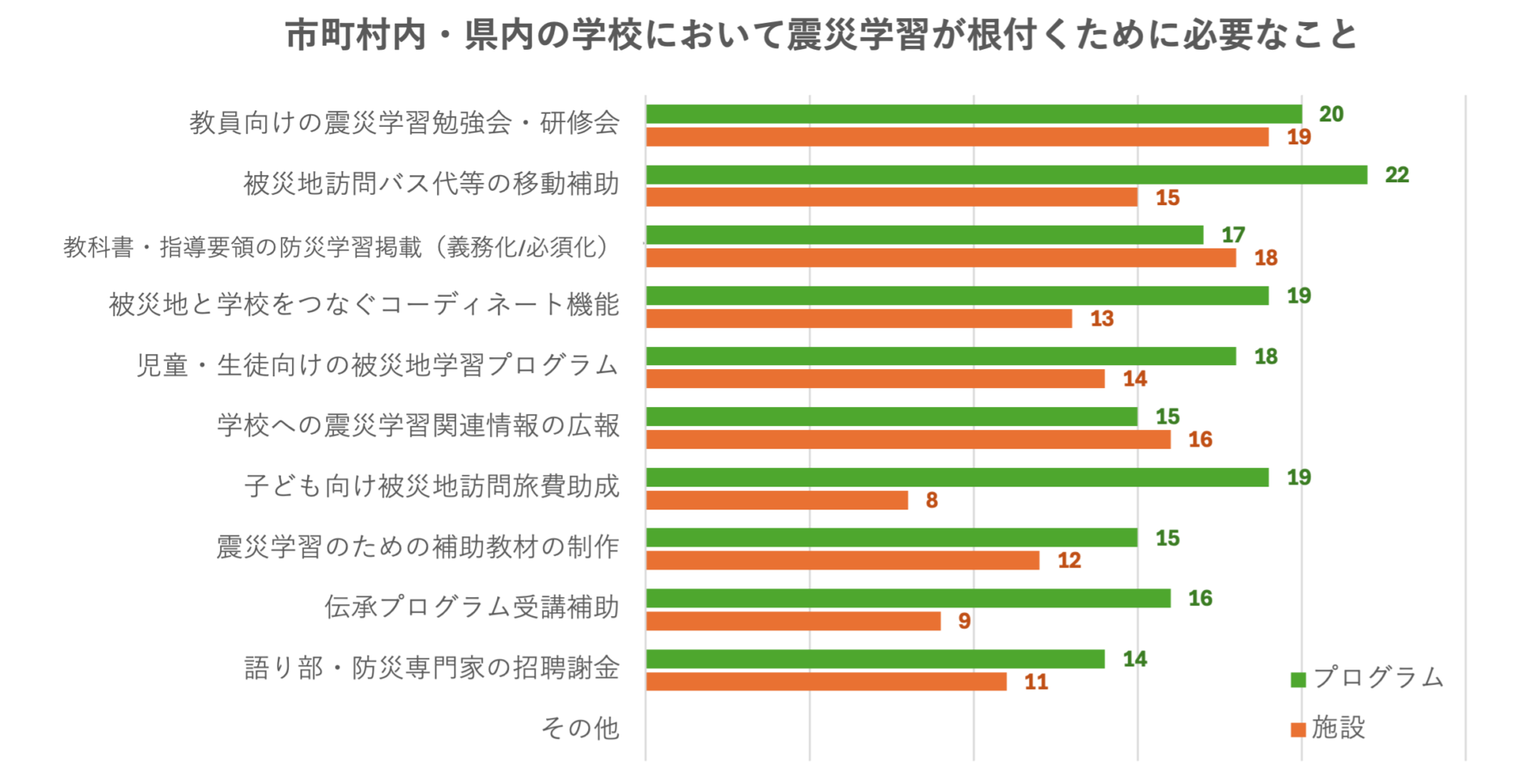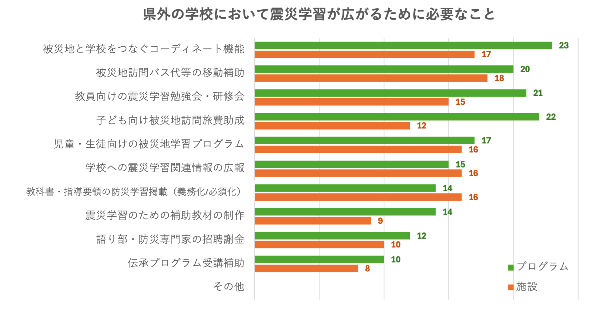 「市町村内・県内の学校」において震災学習が根付くためには、第1が「教員向けの震災学習勉強会・研修会」、第2が「被災地訪問バス代等の移動補助」の順で、回答数が多かった。方「県外の学校」において震災学習が広がるためには、第1が「被災地を学校をつなぐコーディネート機能」、第2が「被災地訪問バス代等の移動補助」であった。第2のバス代補助が県内・県外共に求められていたが、最多回答は、県内は「教員向けの震災学習勉強会」、県外は「コーディネート機能」と、回答が分かれた。