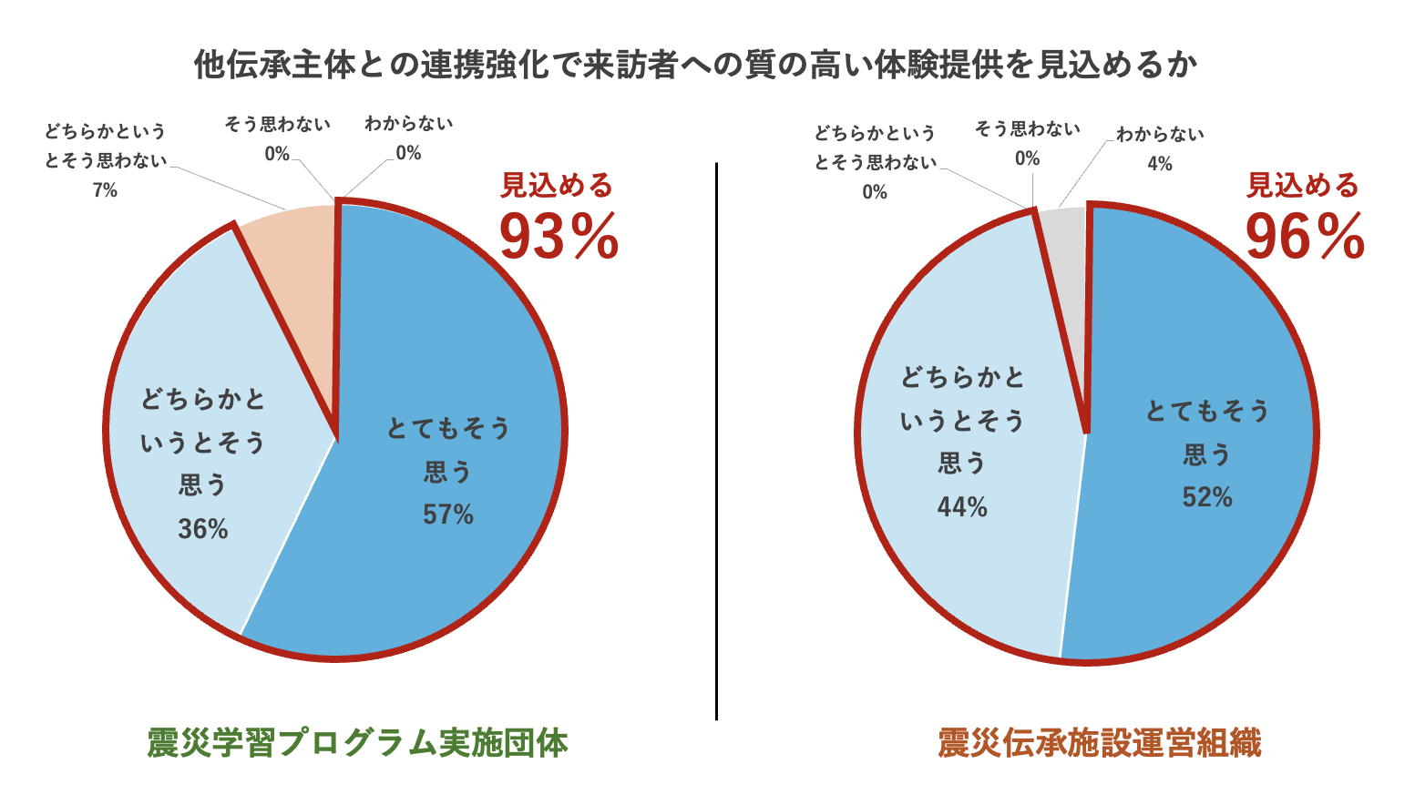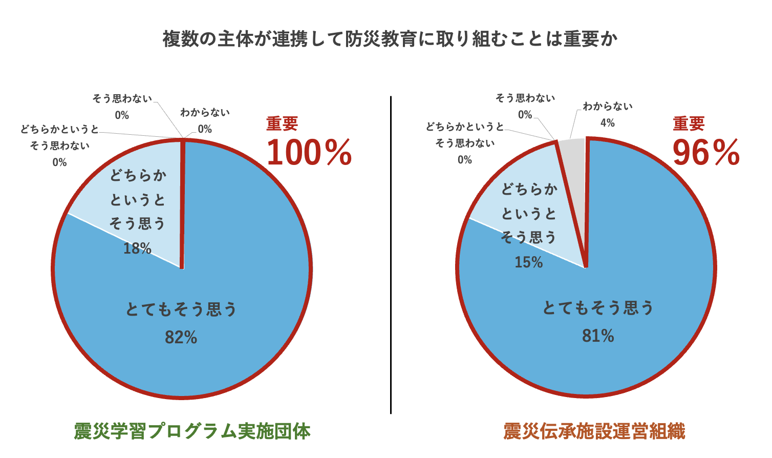 伝承団体は100%、伝承施設は96%から、複数の主体が連携して防災教育に取り組むことの重要性について「とてもそう思う」または「どちらかというとそう思う」との回答が得られた。