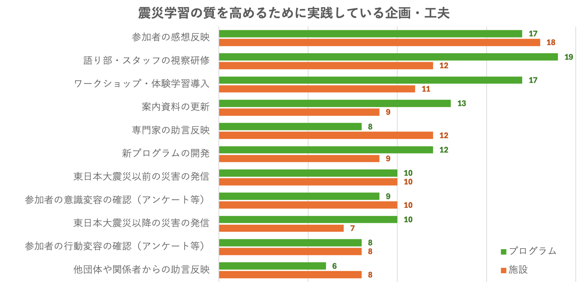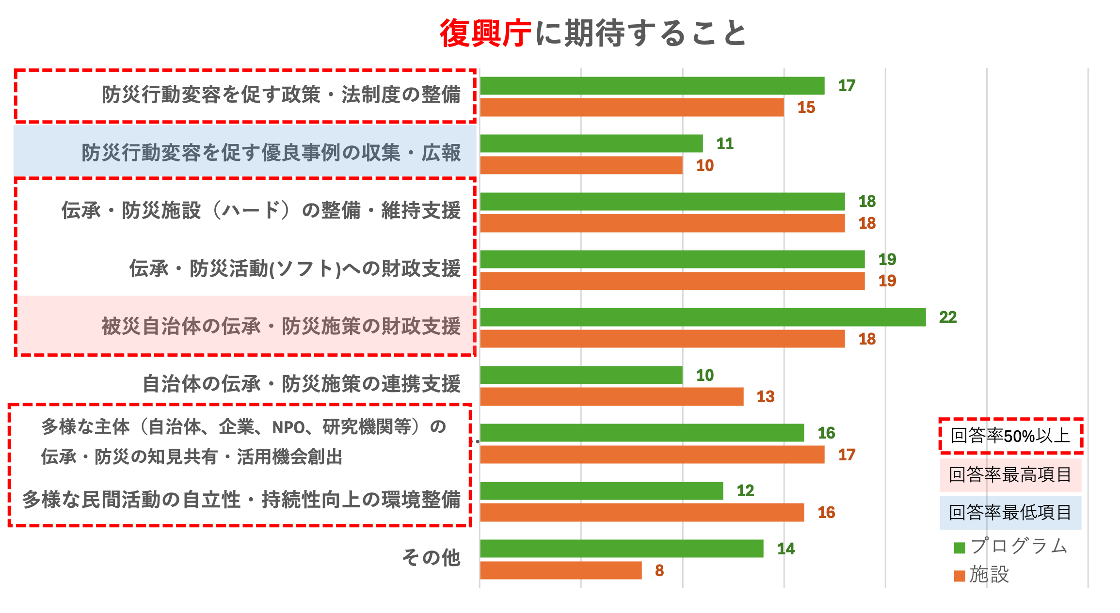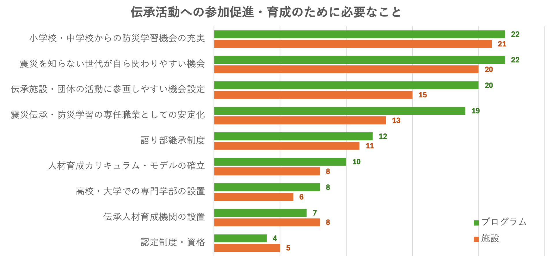 また、伝承団体と伝承施設からの回答で5件以上の差があった項目は「岩手・宮城・福島での広域的な震災学習ツアー推進」(団体19件、施設12件)、「岩手・宮城・福島の個別の伝承活動の広報」(団体11件、施設16件)、「伝承団体を支える基金寄付募集と助成」(団体15件、施設10件)であった。