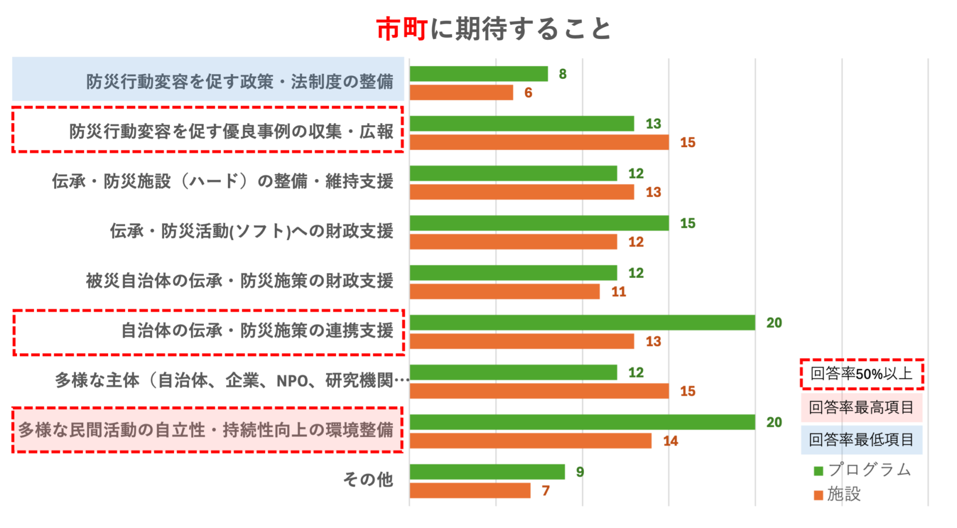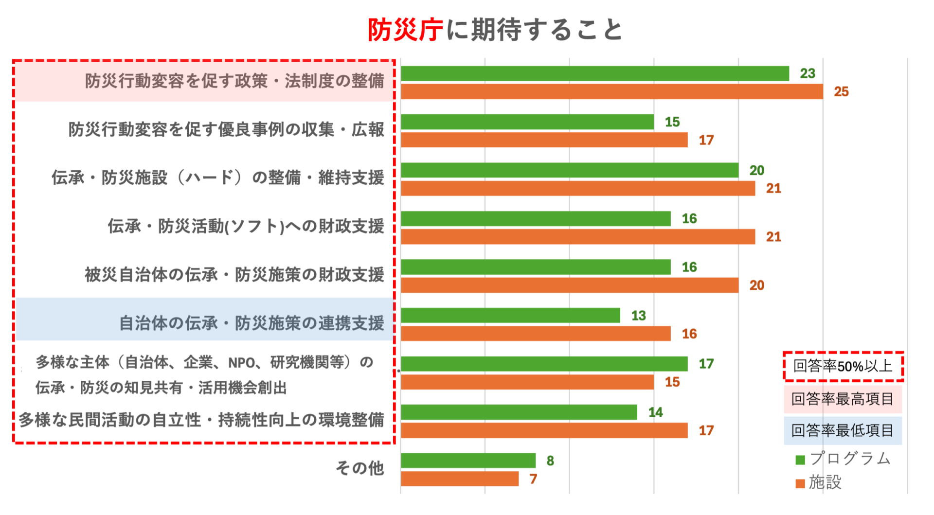 「復興庁に期待すること」は「被災自治体の伝承・防災施策の財政支援」、「防災庁に期待すること」は「防災行動を促す政策・法制度の整備」であり、「県に期待すること」は「自治体の伝承・防災施策の連携支援」、「市町に期待すること」は「多様な民間活動の自立性・持続性向上の環境整備」で、国、県、地方自治体に向けて、それぞれ異なった役割と期待が寄せられていました。