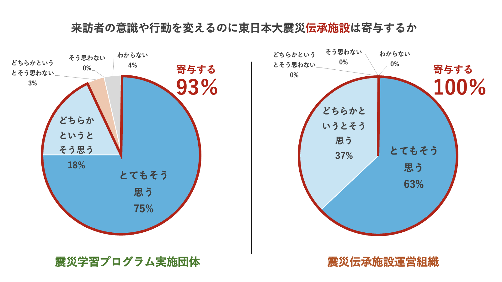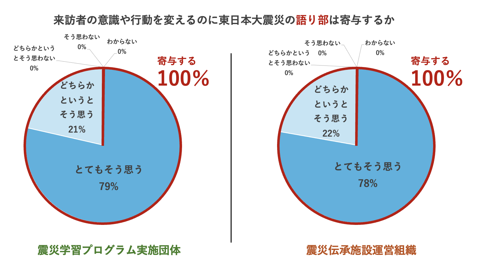 防災庁新設の議論がある中、未来の命を守る防災意識や行動の喚起の視点から「来訪者の意識や行動を変えるために語り部/震災伝承施設は寄与するか」を初めて尋ねたところ、来訪者の意識・行動変化への寄与について伝承施設からの回答は「震災伝承施設」に対して「とてもそう思う」が63%、「震災の語り部」に対して「とれもそう思う」が78%で、「語り部」への高い評価が確認されました。また、伝承団体からの回答も「震災伝承施設」に対して「とてもそう思う」が74%、「震災の語り部」に対して「とてもそう思う」が79%でした。「とてもそう思う」「どちらかというとそう思う」も加えると、「語り部」も「震災伝承施設」も100%もしくはそれに近い方が来訪者の意識・行動変化への寄与を実感しており、震災伝承施設と語り部の組み合わせが、防災行動につながることが示唆されたと考えております。