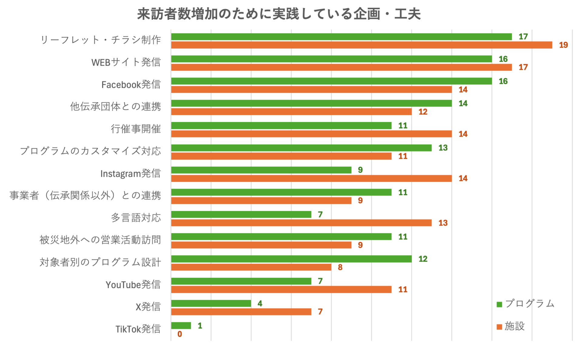 来訪数増加のための企画・工夫に対して、伝承施設の方が多くの回答が得られた。
