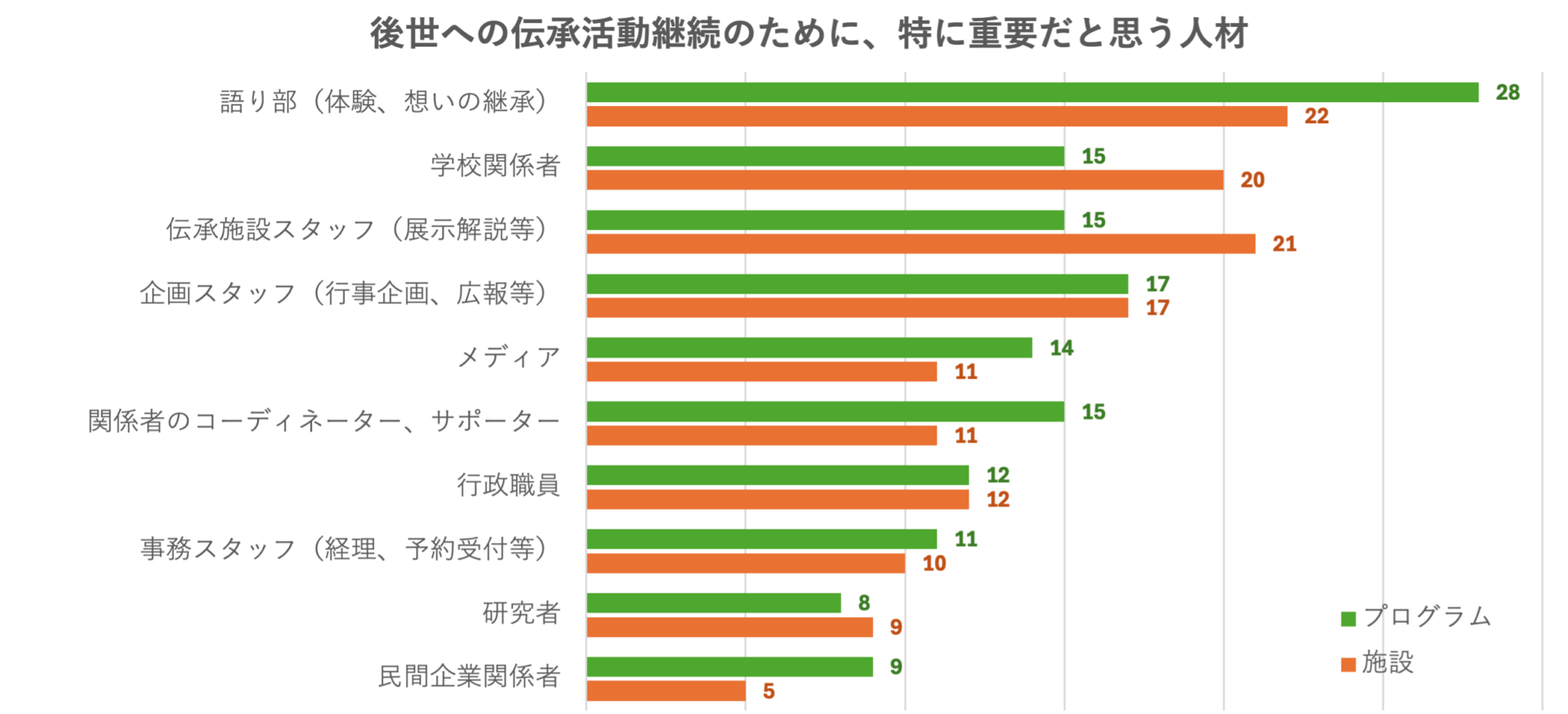 後世への伝承継続に特に重要と思う人材は、伝承団体・伝承施設共に「語り部」が最多の回答を得た。