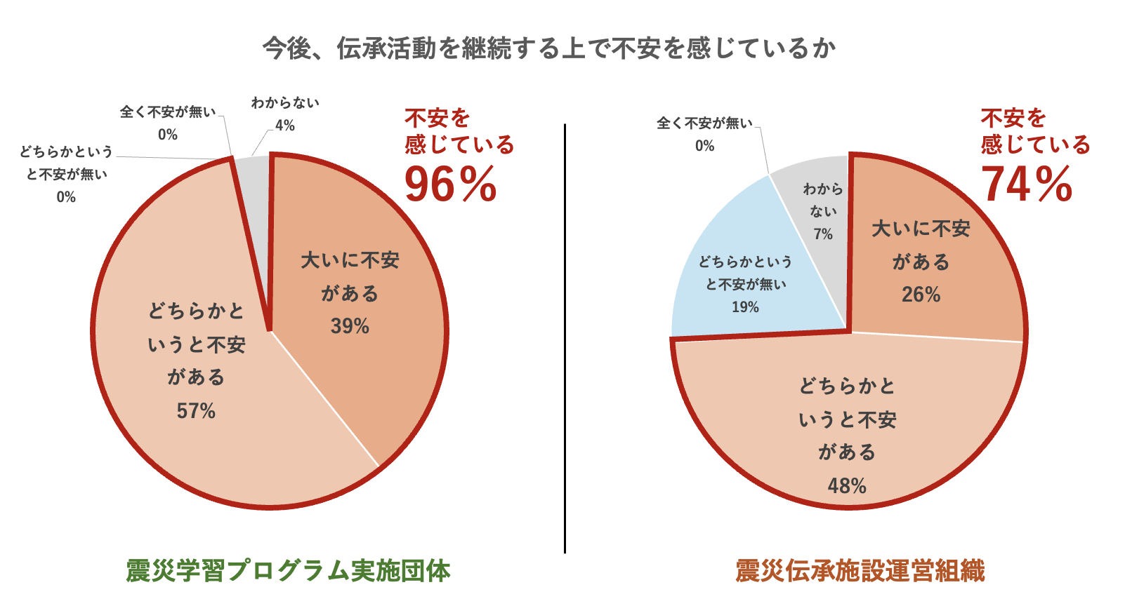 伝承団体の96%、伝承施設の73%が継続性の不安に関して「大いに不安がある」または「どちらかというと不安がある」と回答した。
