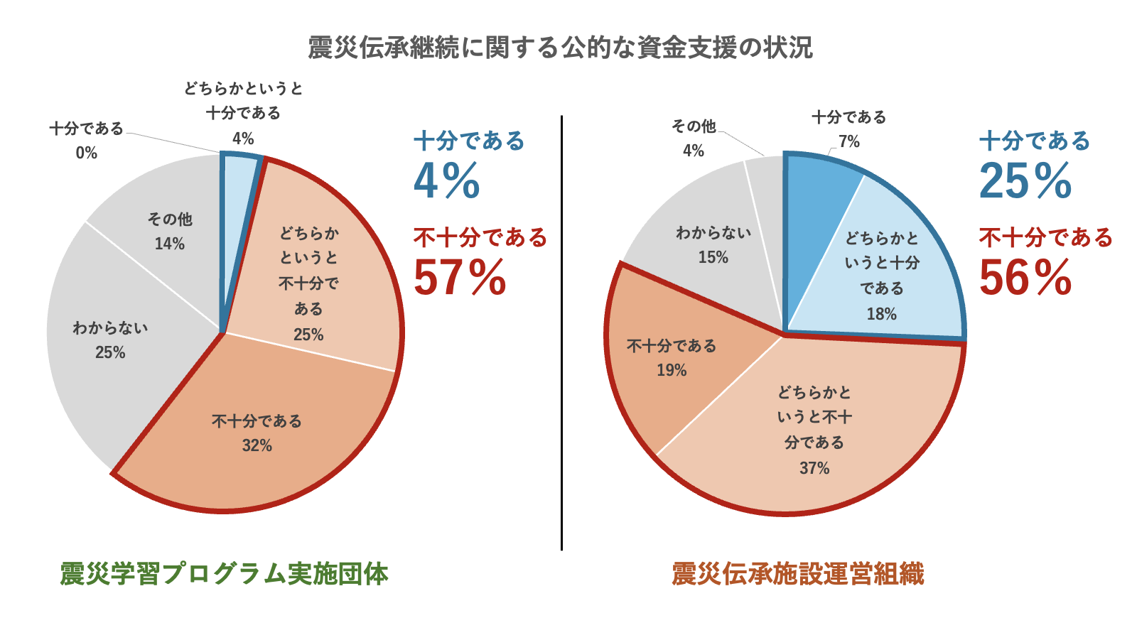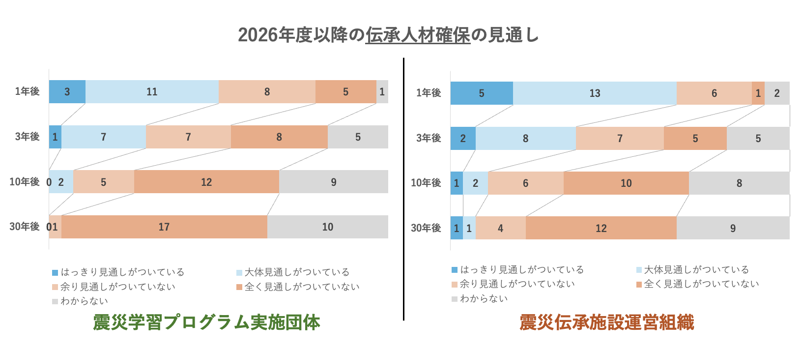 30年後に伝承人材の継続見込みのある伝承団体は0、施設2組織のみ、という厳しい環境ではありますが、成果指標も共有されていない新しい取り組みであるからこそ、震災伝承活動の充実と活性化により次の災害から命が守れる期待が確認された調査でもあると捉えておりあmす。