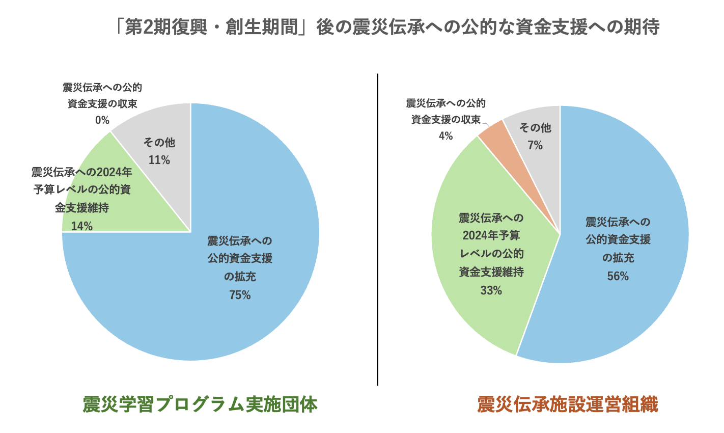 「第2期復興・創生期間後」の公的な資金支援への期待を尋ねたところ、伝承団体の76%、伝承施設の54%が「拡充」への期待を示した。