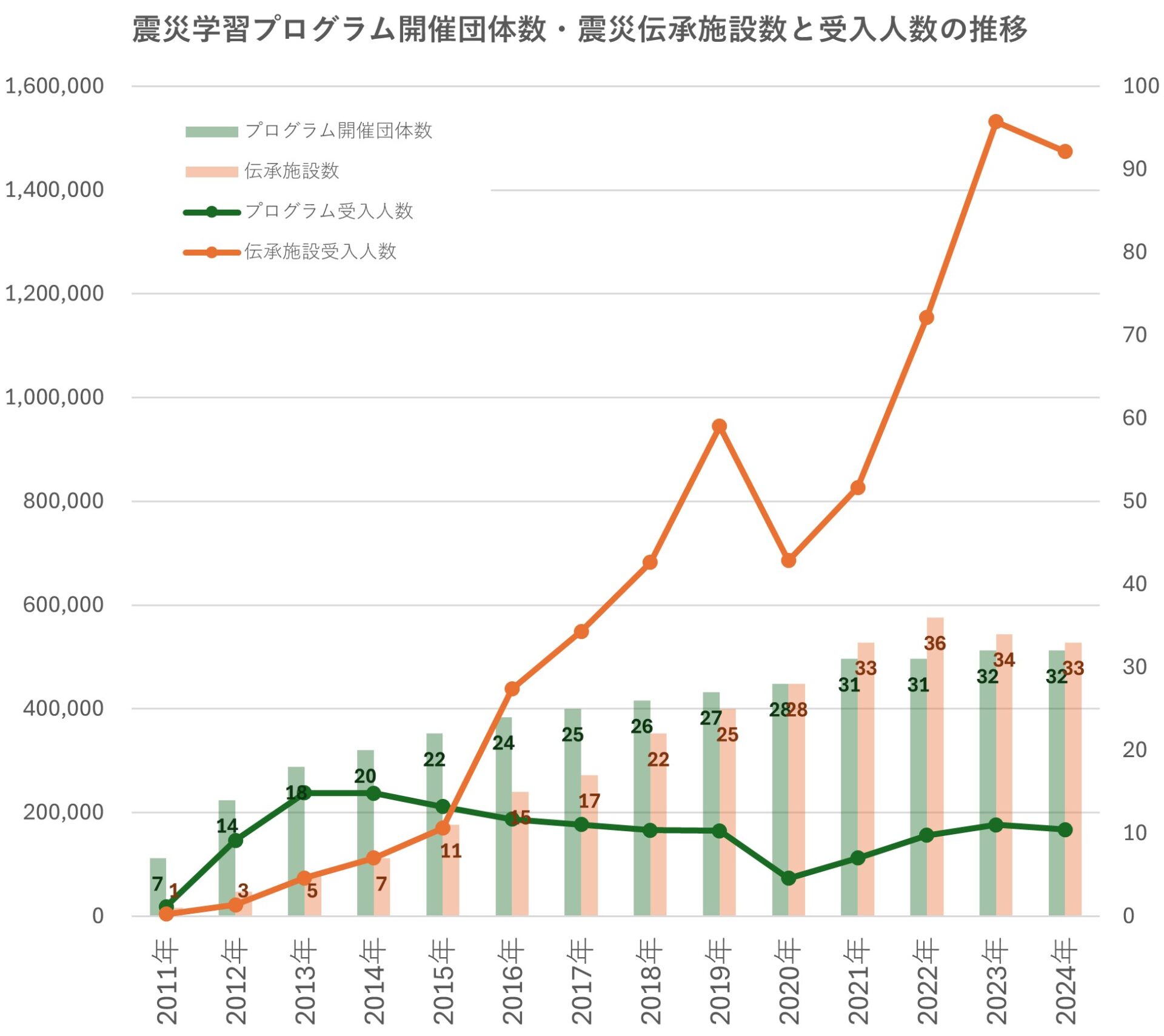 ・14年間の震災伝承団体、伝承施設の数と来訪数の推移