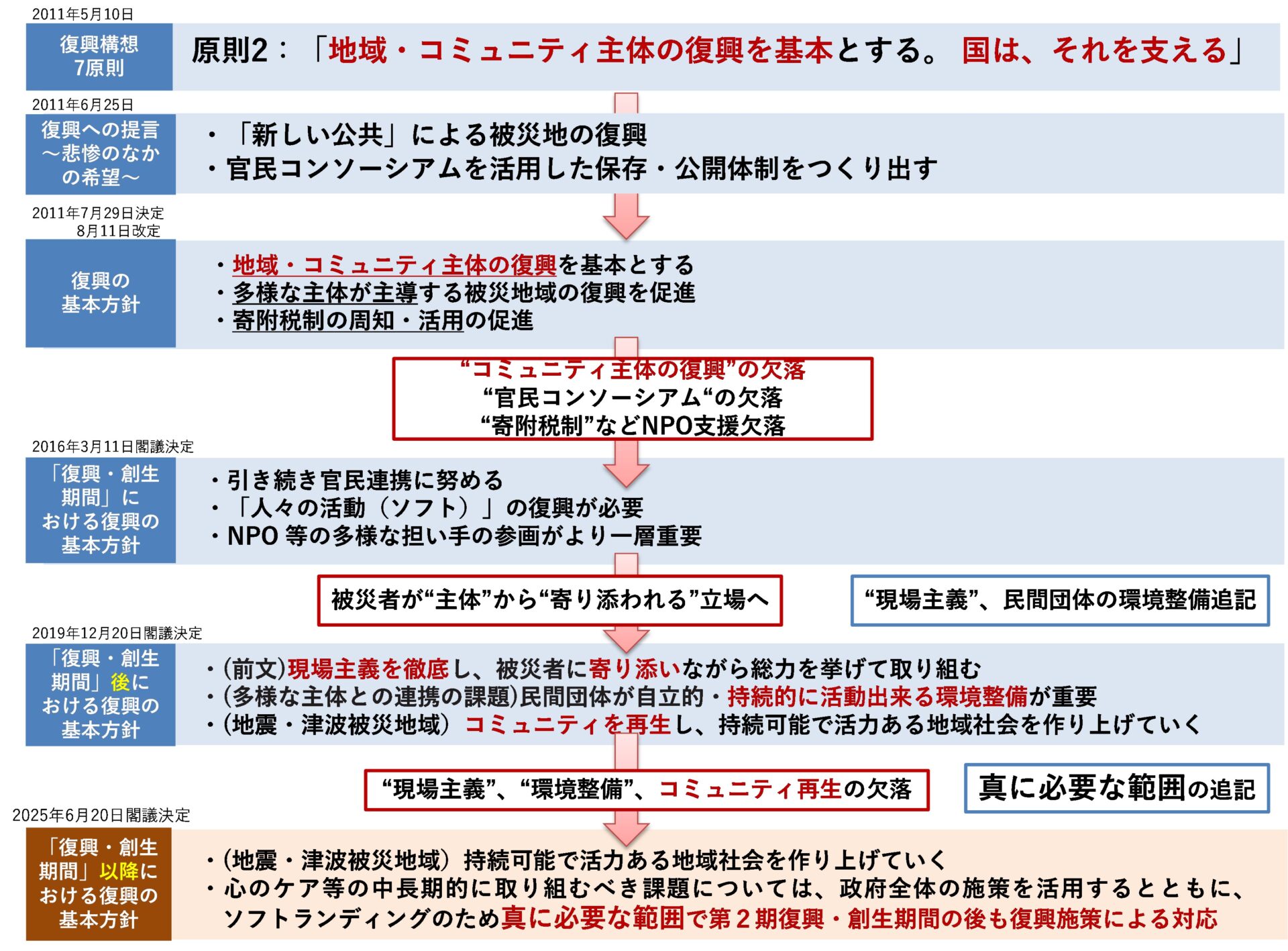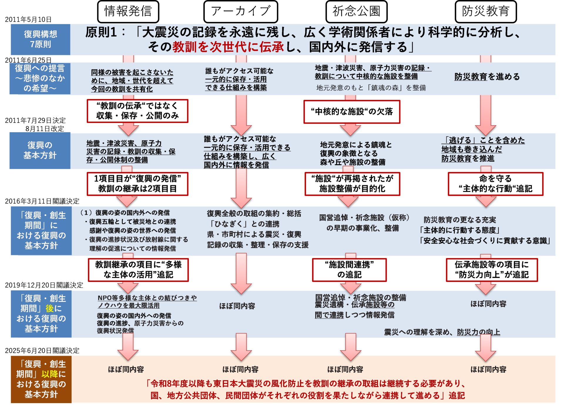 2020年震災伝承調査において、「復興原則第1:教訓を次世代に伝承」と、「復興原則第2:地域・コミュニティ主体の復興」の2原則について、「8年後復興方針」までの整理をしていたが、そこに「14年後復興方針」の変更点を追記すると下図のように示される