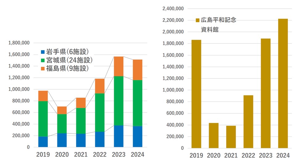 震災伝承に関しては、「重くて暗い」、「14年も経過している」ことから、収束もやむを得ないとする見解もある。しかしながら、広島市の平和記念資料館(原爆資料館)の来訪数は、2024年12月までの最新動向によれば、コロナ禍により2年間激減した後、V字回復し、2024年にはコロナ禍前よりも増加し220万人に達している。一方で、東北の伝承施設の来訪数は2023年から2024に減少に転じており、その39施設(閉館含む)の合計数も広島市平和記念資料館1館の来館数より少ないのが現状である。